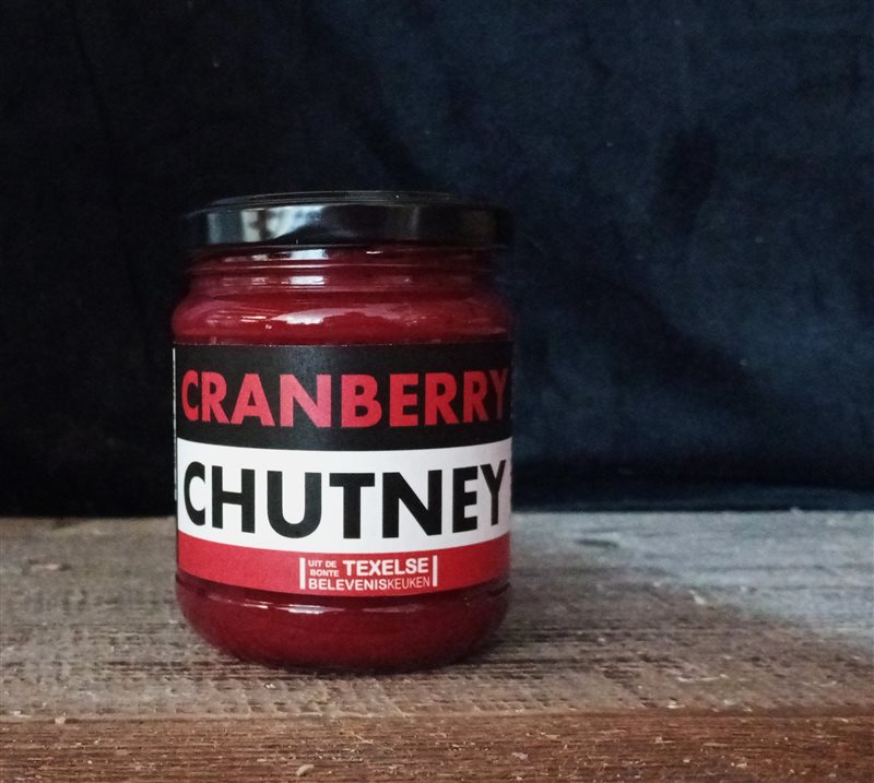 Ingredienten: Texelse cranberry, basterdsuiker, rode wijnazijn, appel, sinaasappel, ui, citroenspa, kruiden en specerijen.