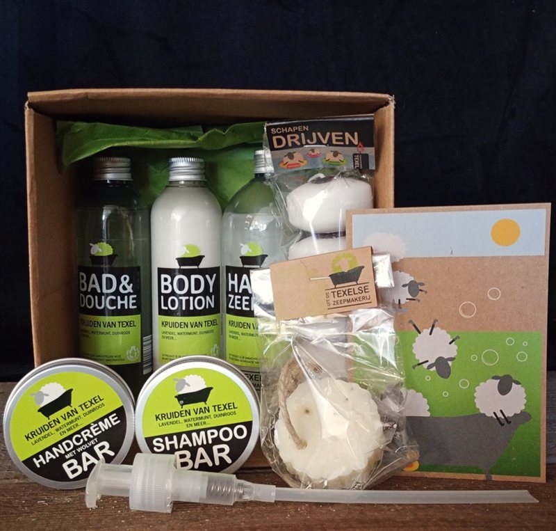 Heerlijk 'geniet-pakket in de , door onze Zeepmakerij, ontwikkelde geur: Kruiden van Texel.